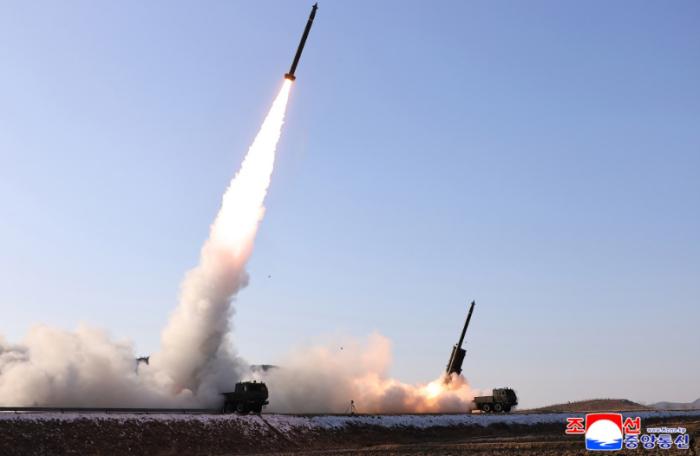 朝鲜进行更新型大口径火箭炮武器系统试射 金正恩观摩